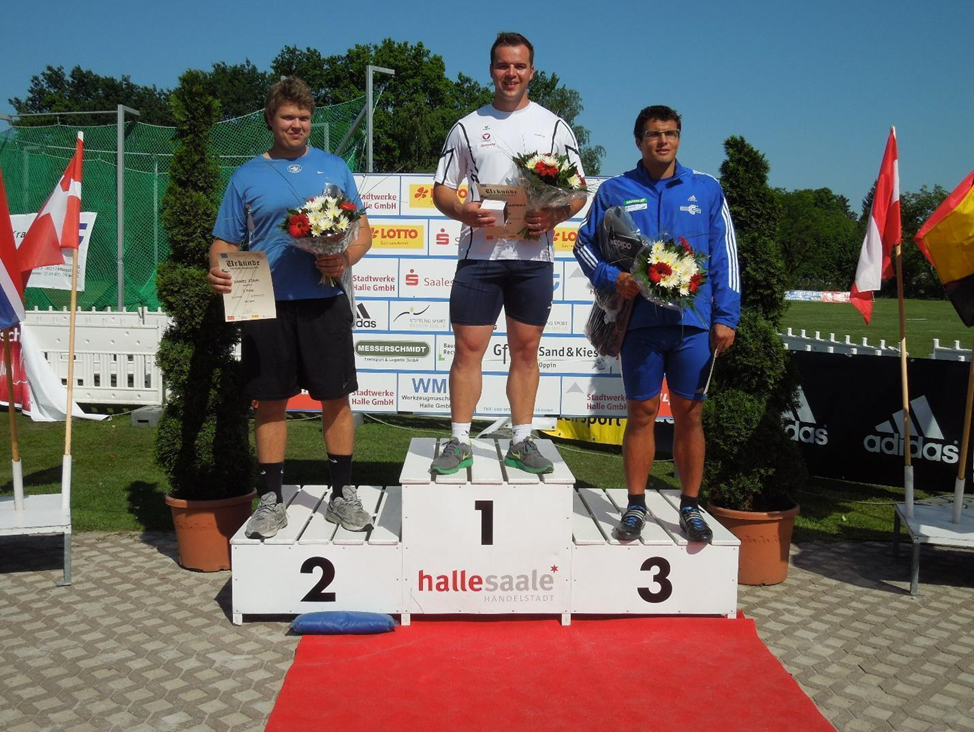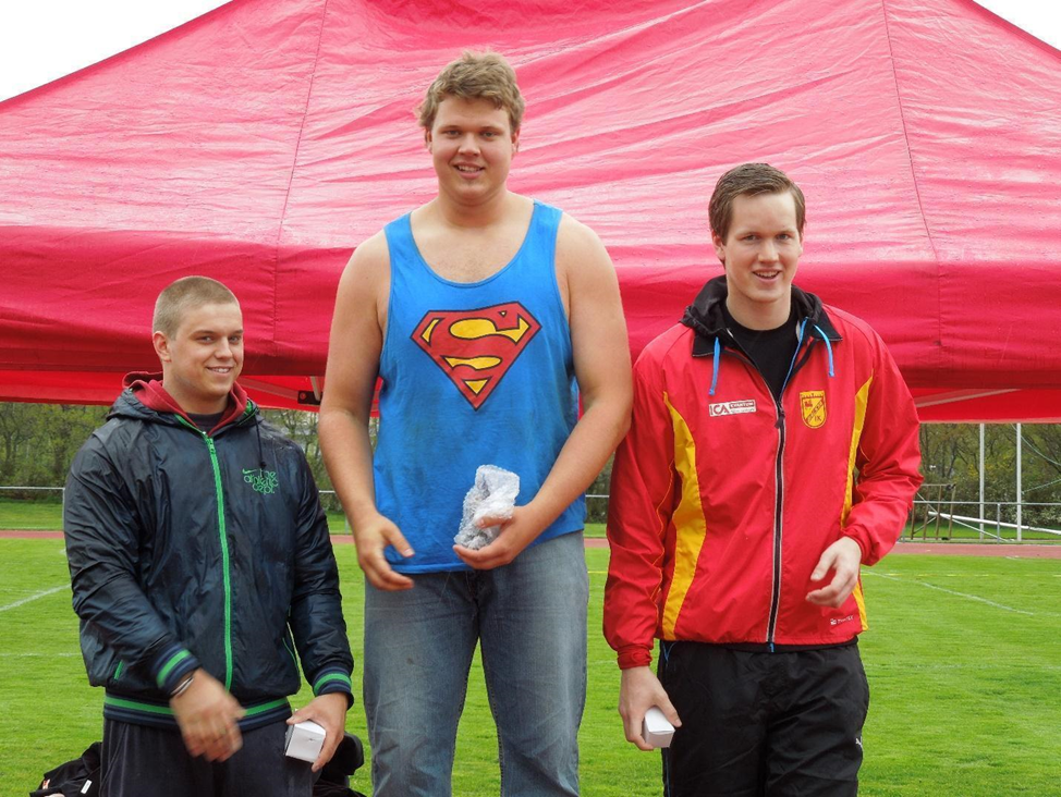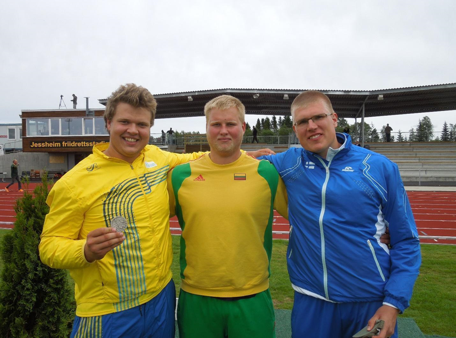 Caption: Daniel finished second at a Nordic vs Baltic U22 meet in Jessheim, Norway to Andrius Gudžius of Lithuania (center) and Ville Kivioja of Finland was third. Gudžius won the meet beating Daniel 61.44 to 61.42